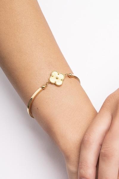 Byzylyk i thjeshtë dhe i rafinuar me një lule të vetme Vanceef në ngjyrë gold, që sjell një ndjesi femërore, të pastër dhe të përjetshme. I punuar nga çelik inox 316 dhe i veshur me PVD Gold 18K, ky byzylyk përfaqëson elegancën e heshtur. Dizajni i tij i hollë dhe i balancuar e bën të përshtatshëm për çdo ditë, solo ose i kombinuar me aksesorë të tjerë.