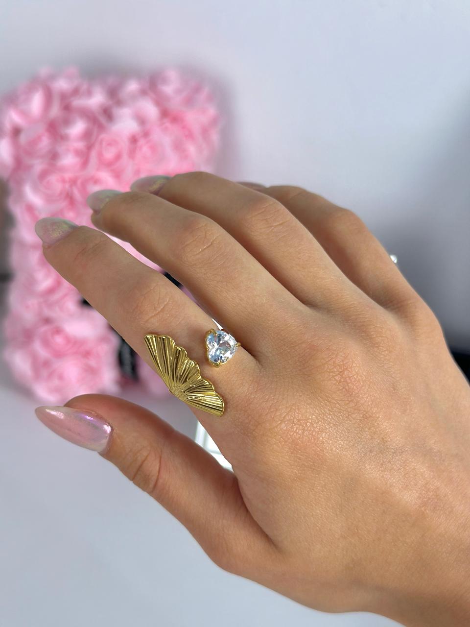 Një kombinim elegant i një guri zirkon me shkëlqim dhe një detaji të artë me formë të veçantë. E punuar nga Stainless Steel 316 dhe e veshur me PVD Gold 18K, kjo unazë ofron qëndrueshmëri, shkëlqim të gjatë dhe është hipoalergjike – perfekte për përdorim të përditshëm apo raste të veçanta.