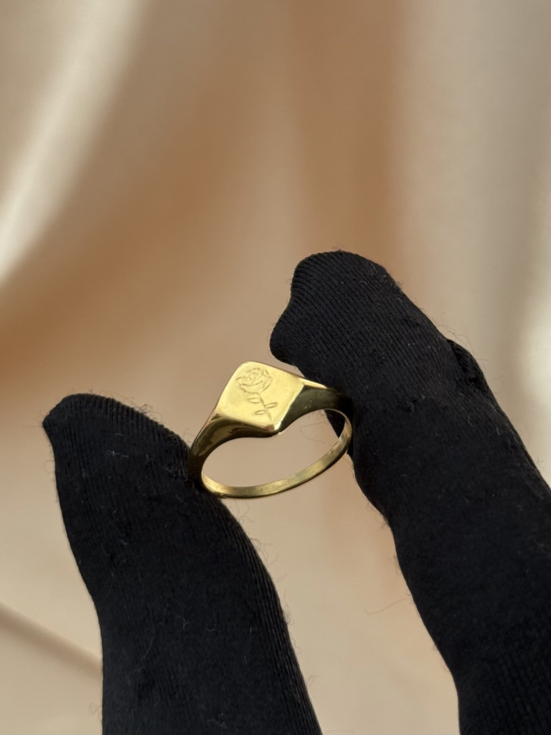 Kjo unazë me lule të vizatuar është një kombinim perfekt i linjave moderne dhe natyrës së gjallë. Forma gjeometrike përfaqëson stabilitetin, ndërsa lulja mbi të sjell butësi, feminitet dhe ndjeshmëri. 🌸✨